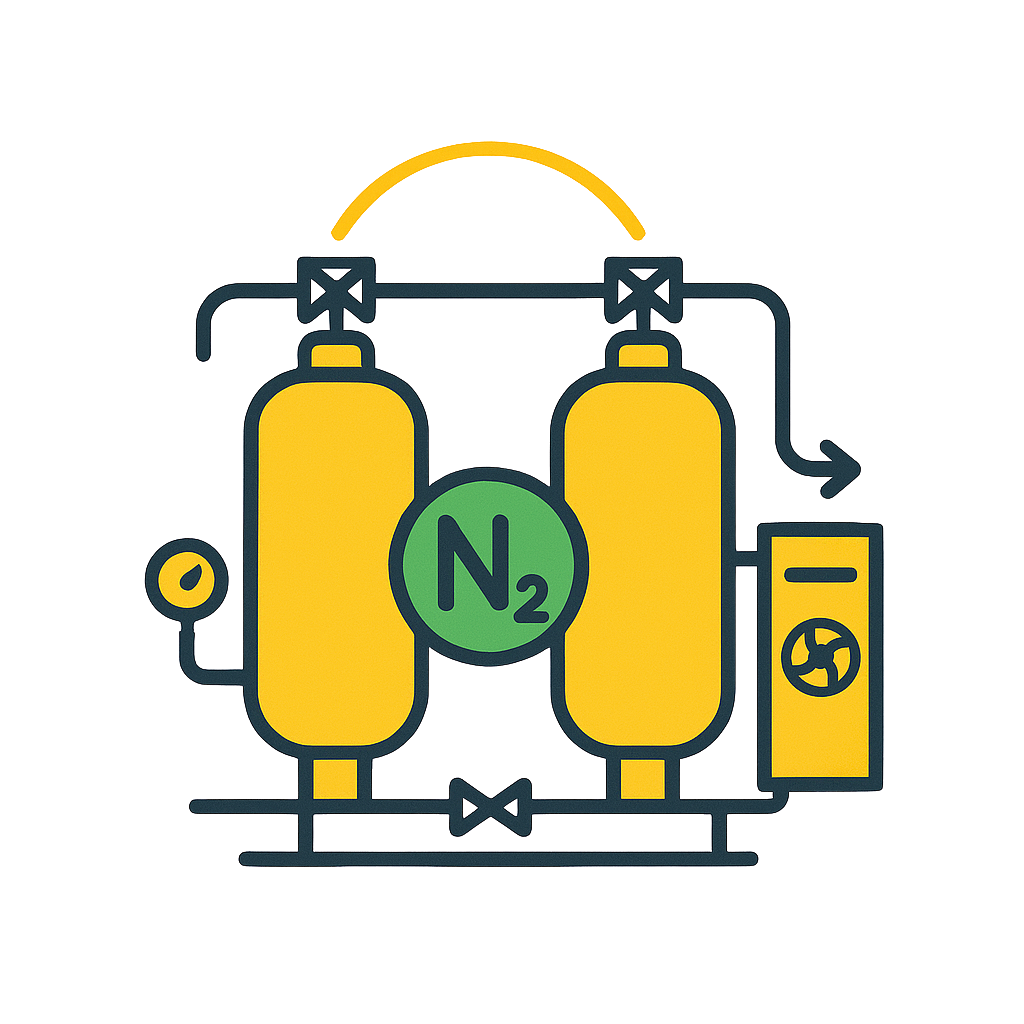 نیتروژنسازهای فیدار کمپرسور با فناوری PSA، نیتروژن با خلوص تا ۹۹.۹۹۹٪ تولید میکنند. بستر CMS با جذب انتخابی اکسیژن، گازی پایدار، ایمن و مناسب صنایع حساس مانند الکترونیک، لیزر، دارویی و بستهبندی فراهم میسازد.