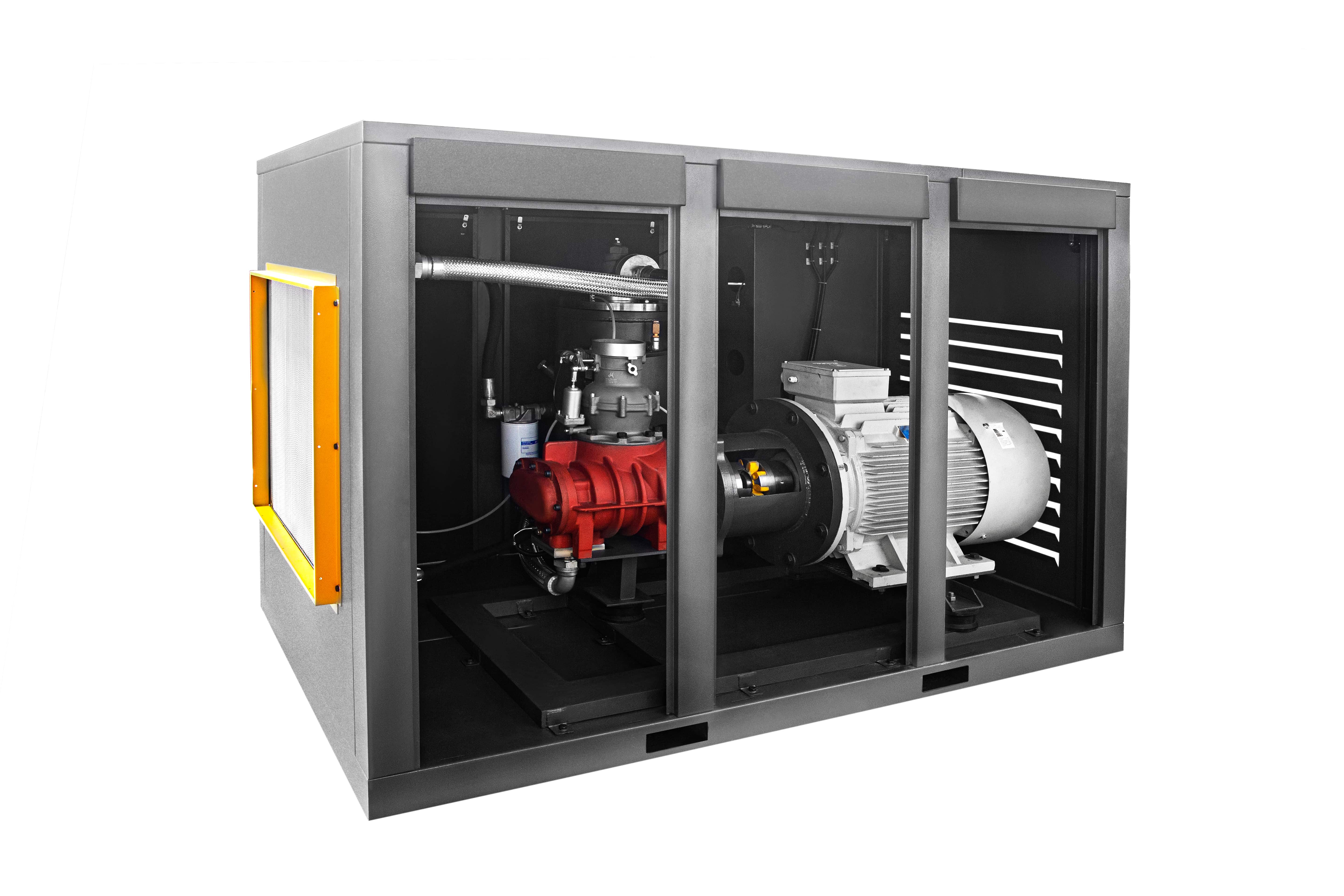 اما اگر نیاز به کمپرسور اسکرو تسمه ای (Belt Drive) با دبی ۱۰۰۰۰ لیتر بر دقیقه در فشار ۱۰ بار داشته باشید، میتوان از واحد هواساز برند ROTORCOMP به همراه الکتروموتور ۷۵ کیلووات استفاده کرد. این گزینه از نظر هزینه اولیه مقرون به صرفه تر است، اما در سیستم تسمه ای برای دستیابی به دبی مورد نیاز، معمولاً با تغییر سایز پولیها سرعت چرخش واحد هواساز افزایش می یابد که این موضوع می تواند موجب کاهش عمر مفید ایرند شود.